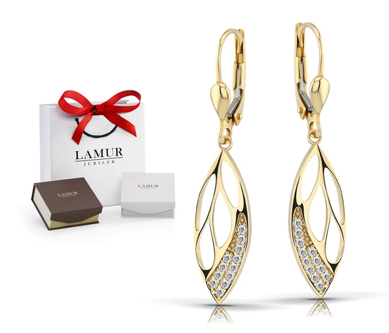 Kolczyki o subtelnym, liściastym kształcie zachwycają delikatnością i finezją wykonania. Ażurowa forma nadaje im lekkości, a zdobienie lśniącymi cyrkoniami wzdłuż jednej z krawędzi sprawia, że całość emanuje elegancją i szykiem. To wyjątkowa biżuteria, która pięknie podkreśli urodę i doda blasku każdej stylizacji.