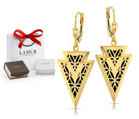 Wyjątkowe złote kolczyki wiszące próby 585 to biżuteria dla kobiet, które lubią wyróżniać się oryginalnym stylem. Nowoczesny, geometryczny kształt trójkątów połączony został z dekoracyjnym wzorem inspirowanym motywami roślinnymi, wypełnionym czarną emalią jubilerską. Kontrast złota i czerni sprawia, że kolczyki przyciągają uwagę, tworząc odważny i elegancki akcent w każdej stylizacji.