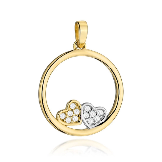 Złota zawieszka w kształcie koła z dwoma serduszkami to biżuteria, która urzeka subtelnością i znaczeniem. Połączenie żółtego i białego złota próby 585 tworzy harmonijną kompozycję, a błyszczące cyrkonie dodają całości wyjątkowego blasku. Dwa serca splecione w jednym wzorze symbolizują miłość, bliskość i nierozerwalną więź.