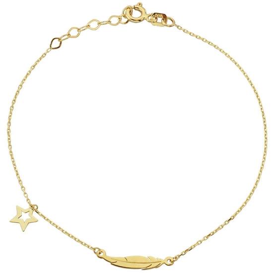 Złota bransoletka z piórkiem i gwiazdką to wyjątkowy dodatek, który podkreśli Twoją indywidualność i doda blasku każdej stylizacji.