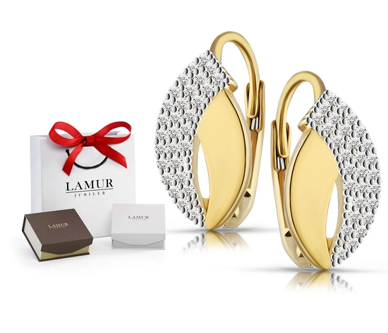 Prezentowane kolczyki to szykowna propozycja wykonana z żółtego złota próby 585, która zachwyca połączeniem klasyki z nowoczesnym blaskiem. Ich delikatnie zakrzywiona forma została częściowo pokryta połyskującymi cyrkoniami, które tworzą efektowną mozaikę i pięknie odbijają światło. Harmonijne zestawienie gładkiej powierzchni złota i drobnych kamieni nadaje biżuterii wyjątkowego charakteru.