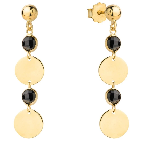 Te wyjątkowe złote kolczyki wiszące próby 585 to połączenie klasycznej elegancji z odrobiną nowoczesności. Wykonane z najwyższej jakości złota, zachwycają subtelną kompozycją geometrycznych, złotych elementów w formie gładkich krążków, które pięknie odbijają światło przy każdym ruchu. Centralnym akcentem biżuterii są fasetowane onyksy – kamienie o głębokiej, czarnej barwie, które dodają kolczykom wyrazistości i tajemniczego charakteru.