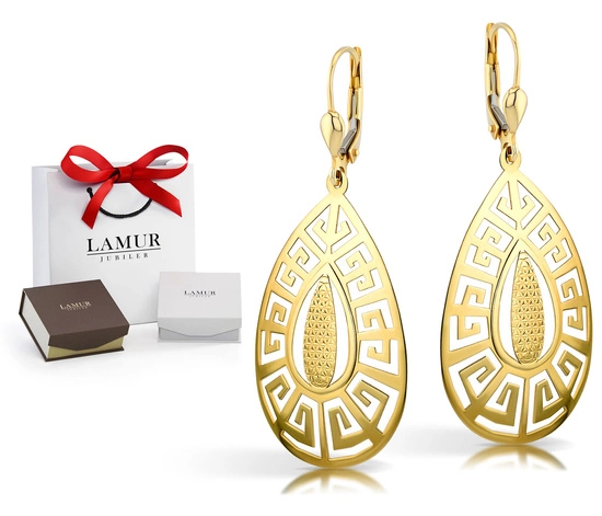 Wyjątkowe kolczyki wiszące próby 585 to połączenie nowoczesnej elegancji z klasycznym motywem. Ich kształt łezki został ozdobiony greckim wzorem, który nadaje całości charakteru i niepowtarzalnego stylu. Centralna część kolczyka wykończona jest subtelnym zdobieniem, pięknie odbijającym światło przy każdym ruchu.