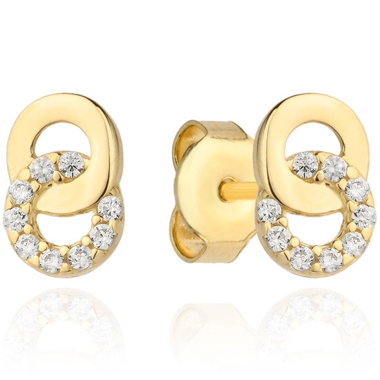 Prezentowane kolczyki to elegancka propozycja wykonana z żółtego złota próby 585, która łączy klasykę z nowoczesnym blaskiem. Ich forma oparta jest na dwóch splecionych kołach – symbolu harmonii i równowagi. Jedno z nich zostało pokryte gładką, lśniącą powierzchnią złota, drugie zaś ozdobiono błyszczącymi cyrkoniami, które pięknie odbijają światło, dodając biżuterii wyjątkowego uroku.