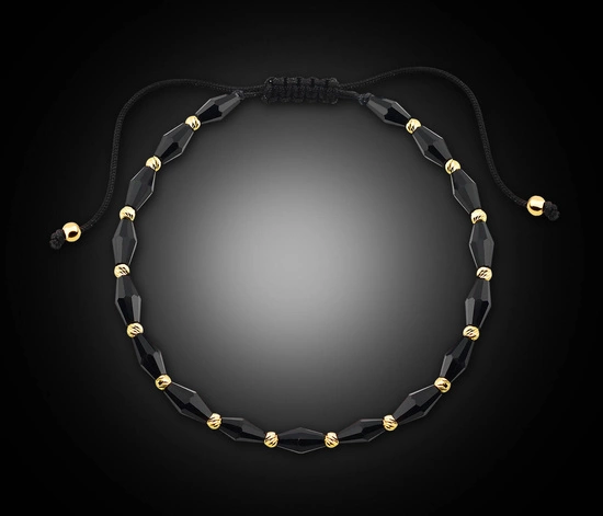 Elegancka bransoletka wykonana ze złota próby 585 w połączeniu z czarnym, regulowanym sznurkiem to wyjątkowa propozycja dla osób ceniących nowoczesny styl i symbolikę kamieni. Jej główną ozdobę stanowią pięknie oszlifowane onyksy syntetyczne, przeplatane złotymi kuleczkami, które tworzą harmonijną i wyrazistą całość. Bransoletka została wykonana ręcznie, co podkreśla jej unikalny charakter i dbałość o najmniejsze detale.