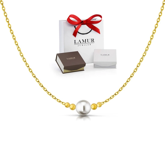Złoty naszyjnik próby 585 to subtelna biżuteria, która łączy ponadczasową elegancję z nowoczesną lekkością. Centralnym punktem naszyjnika jest biała perła syntetyczna, otoczona z obu stron drobnymi złotymi kuleczkami. Prosta, ale wyrafinowana kompozycja sprawia, że naszyjnik zachwyca swoją delikatnością i uniwersalnym stylem.