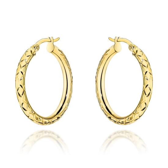 Te złote kolczyki koła próby 585 zachwycają połączeniem klasycznej formy i nowoczesnego zdobienia. Delikatny diamentowany wzór sprawia, że biżuteria pięknie odbija światło, nadając jej wyjątkowego blasku i lekkości. To model, który doskonale podkreśli zarówno codzienne stylizacje, jak i wieczorowe kreacje.