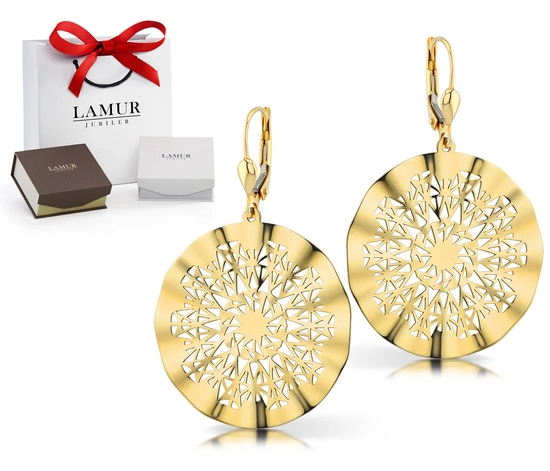 Złote kolczyki wiszące próby 585 to wyjątkowa biżuteria, która łączy klasyczną elegancję z nowoczesnym designem. Ich okrągła forma została ozdobiona ażurowym wzorem przypominającym kwiatową rozetę, co nadaje im lekkości i efektownego charakteru. Delikatnie falowana powierzchnia dodatkowo odbija światło, podkreślając unikalny styl i blask złota.