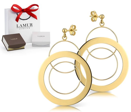Złote kolczyki próby 585 w formie podwójnych kół to propozycja dla kobiet, które lubią odważne i efektowne dodatki. Połączenie dużych, pełnych obręczy z lekkimi, cienkimi okręgami tworzy wyjątkową kompozycję, która przyciąga wzrok i dodaje stylizacji nowoczesnego charakteru. Geometryczny design sprawia, że biżuteria prezentuje się niezwykle modnie i stylowo.