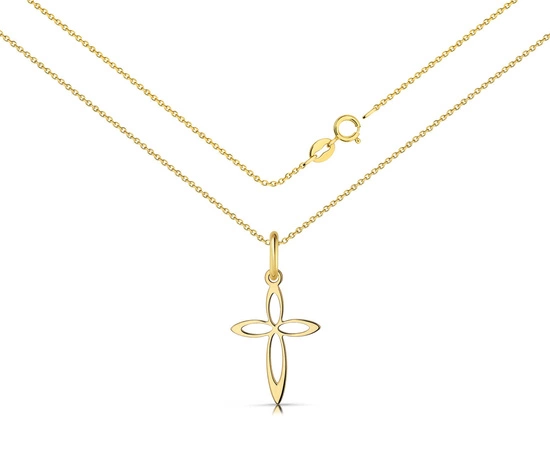 Złoty naszyjnik próby 585 to wyjątkowy dodatek o głębokiej symbolice, który łączy delikatność formy z duchowym przesłaniem. Jego centralnym elementem jest krzyżyk o finezyjnych, ażurowych ramionach, przypominających kształtem łezki lub płatki kwiatu. Dzięki temu klasyczny motyw zyskuje nowoczesny i lekki charakter, który idealnie wpisuje się w elegancki, a zarazem subtelny styl.