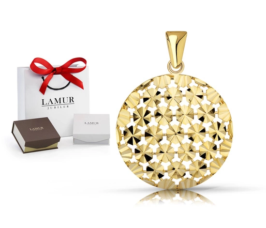 Ta złota zawieszka próby 375 zachwyca precyzyjnym, ażurowym wzorem o geometrycznej harmonii, który pięknie odbija światło dzięki ręcznie wykonanej diamentowanej powierzchni. Każdy detal został dopracowany z jubilerską starannością, tworząc efekt delikatnego połysku i głębi.
