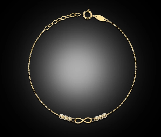 Subtelna i pełna wdzięku złota bransoletka próby 585 została ozdobiona symbolem nieskończoności, który od wieków kojarzony jest z trwałością, wiecznością i nieprzemijającymi wartościami. Dodatkowego uroku dodają jej delikatne złote kuleczki, które pięknie odbijają światło, nadając całości wyjątkowego blasku.