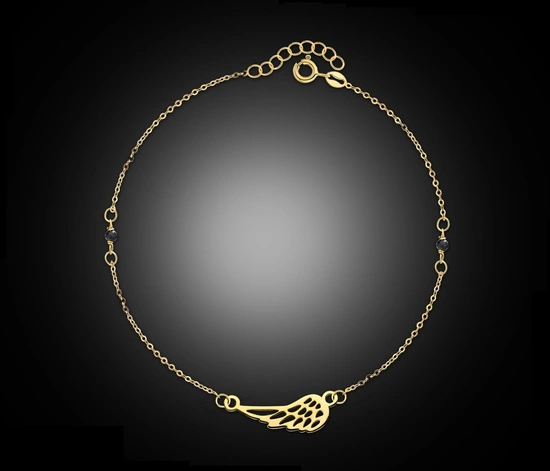 Ta wyjątkowa bransoletka wykonana ze złota próby 585 zachwyca delikatnym motywem skrzydełka, które symbolizuje wolność, opiekę i lekkość. Subtelne onyksy, umieszczone po obu stronach łańcuszka, dodają jej elegancji i głębi, a jednocześnie podkreślają ochronny charakter kamienia.