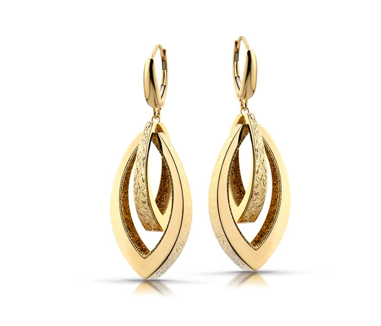 Wyjątkowe złote kolczyki wiszące próby 585 zachwycają nowoczesnym, geometrycznym designem. Ich forma opiera się na dwóch przestrzennych elementach, które tworzą efektowną, wielowymiarową kompozycję. Połączenie gładkiego wykończenia z subtelnym, diamentowanym zdobieniem sprawia, że kolczyki pięknie odbijają światło i przyciągają spojrzenia.