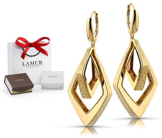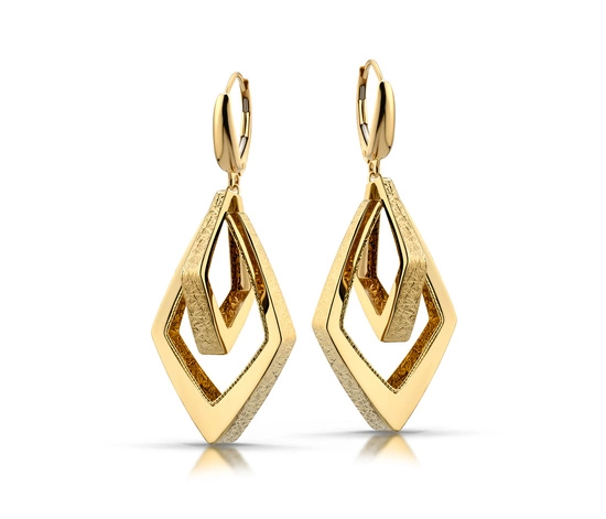 Efektowne złote kolczyki wiszące próby 585 o nowoczesnym, geometrycznym kształcie to biżuteria, która łączy elegancję z odrobiną awangardy. Połączenie dwóch rombów – większego i mniejszego – tworzy przestrzenną formę, która pięknie układa się w ruchu i podkreśla wyjątkowy charakter kolczyków.