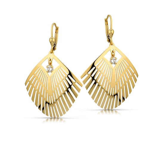 Złote kolczyki wiszące próby 585 w formie ażurowych wachlarzy to propozycja dla kobiet, które pragną połączyć elegancję z nutą nowoczesnego stylu. Otwarta, geometryczna forma inspirowana wachlarzem nadaje biżuterii lekkości, a centralnie osadzona, błyszcząca cyrkonia subtelnie podkreśla jej wyjątkowy charakter.