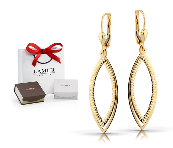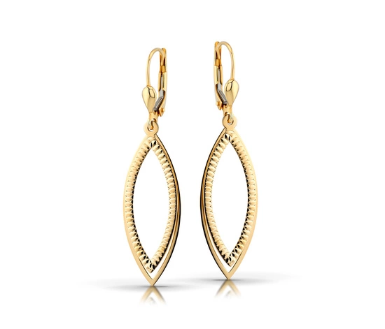 Delikatne, a zarazem wyraziste złote kolczyki wiszące próby 585 to propozycja dla kobiet ceniących klasyczną elegancję w nowoczesnym wydaniu. Smukły, podłużny kształt z finezyjnie diamentowanym wykończeniem pięknie odbija światło, podkreślając urodę i dodając stylizacji wyjątkowego charakteru.