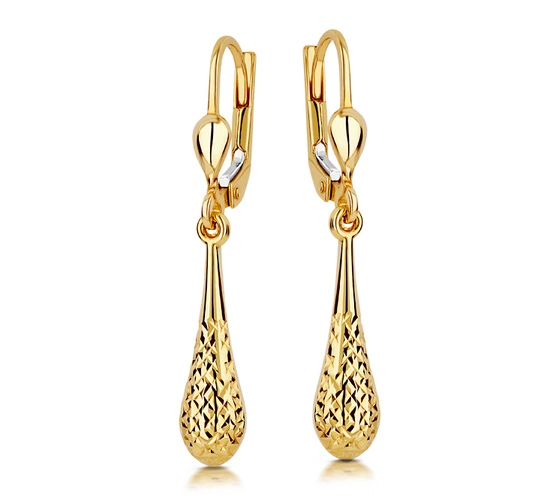 Złote kolczyki próby 375 to harmonijne połączenie subtelności i wyrafinowanego stylu. Smukła forma inspirowana kształtem kropli sprawia, że kolczyki delikatnie wydłużają szyję i pięknie podkreślają rysy twarzy. Ich powierzchnia została ozdobiona precyzyjnym diamentowaniem, które wspaniale odbija światło, nadając biżuterii wyjątkowego, migoczącego blasku.