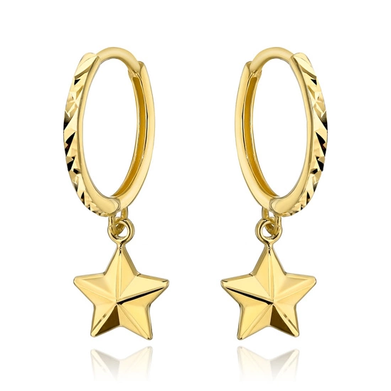 Złote kolczyki próby 585 w formie delikatnych kółeczek z zawieszką w kształcie gwiazdek to biżuteria pełna wdzięku i lekkości. Diamentowanie nadaje kolczykom wyjątkowego uroku i przyciąga wzrok subtelnym blaskiem, który pięknie się mieni. To idealna propozycja dla kobiet i dziewcząt, które kochają biżuterię pełną życia i klasycznych akcentów.