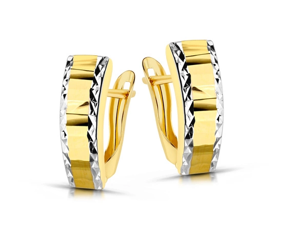 Te wyjątkowe kolczyki zachwycają połączeniem żółtego i białego złota, które wspólnie tworzą elegancką i nowoczesną kompozycję. Dwukolorowe zestawienie nadaje biżuterii oryginalności, a diamentowana powierzchnia pięknie odbija światło, podkreślając blask złota przy każdym ruchu. To model, który doskonale łączy klasykę z odważnym, stylowym akcentem.