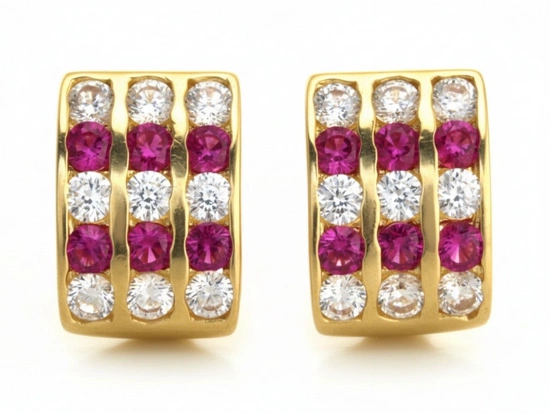 Kolczyki złote trzyrzędowe przecinki z różowymi kamieniami