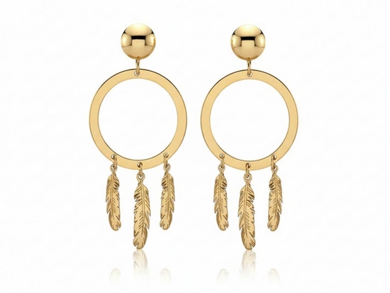 Kolczyki złote kółka z wiszącymi piórkami