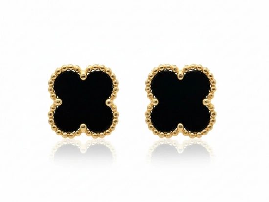 Złote kolczyki kwiatki z czarnym onyksem przy uchu