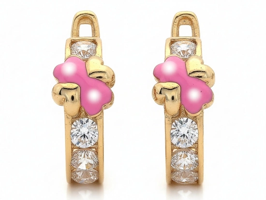Złote kolczyki dla dziewczynki z cyrkoniami i różową emalią