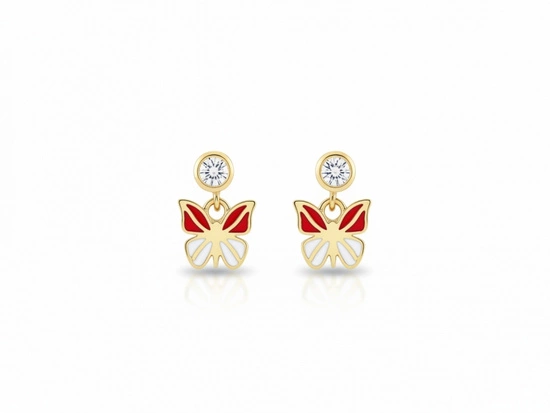 Złote kolczyki na sztyfcie z wiszącym emaliowanym motylkiem