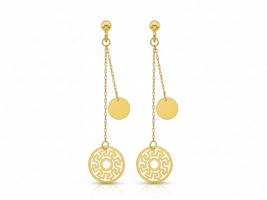 Złote kolczyki długie wiszące z ażurowym kółkiem wzór grecki