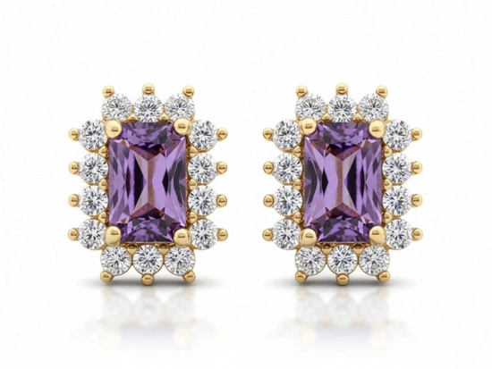 Kolczyki złote prostokątne na sztyfcie z ametystem syntetycznym