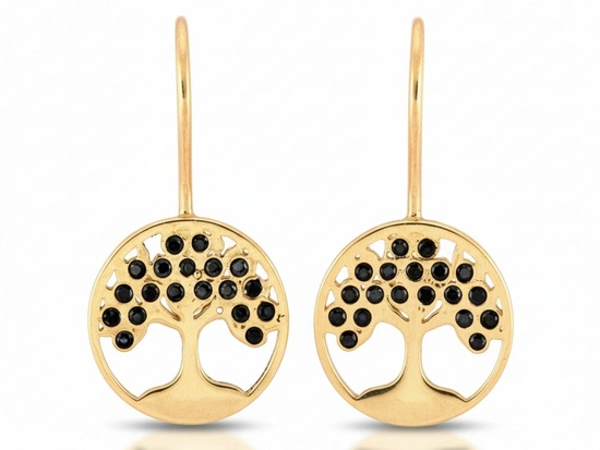 Kolczyki złote na biglu drzewko szczęścia z czarnymi cyrkoniami