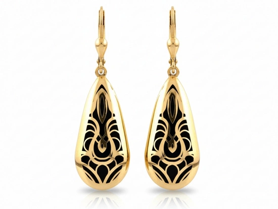 Kolczyki złote wiszące sztywne dmuchane z czarną emalią