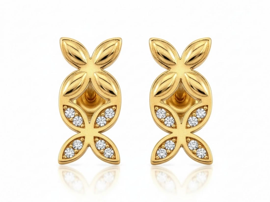 Złote kolczyki dwa kwiatki na sztyfcie przy uchu