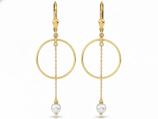 Kolczyki złote angielskie wiszące kółka z perłą na łańcuszku