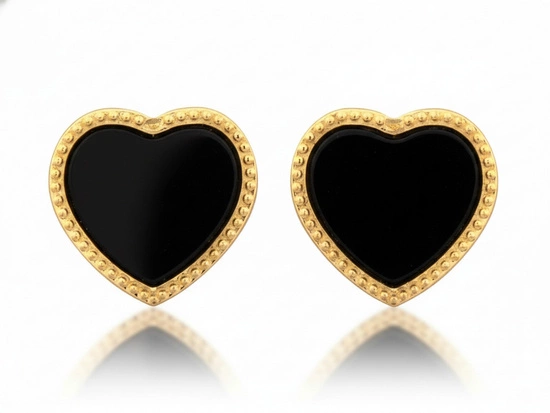 Kolczyki złote serca na sztyfcie z czarnym kamieniem syntetycznym