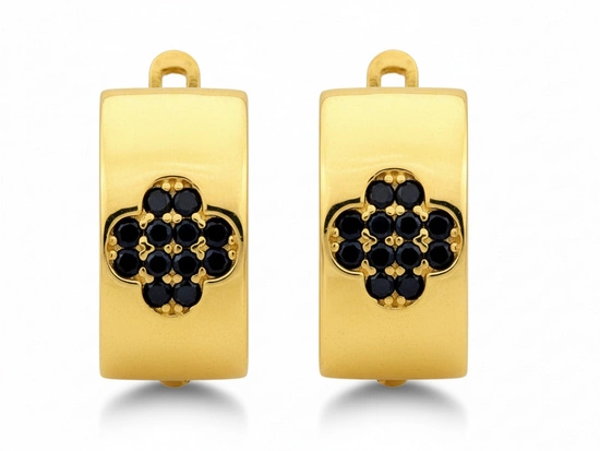 Kolczyki złote angielskie z wzorem koniczynki z czarnych cyrkonii