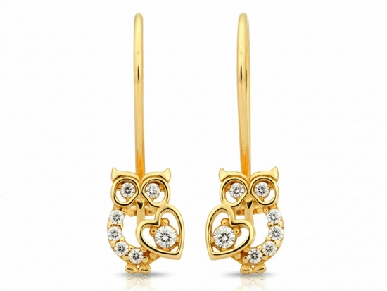 Kolczyki złote sowa z sercem na biglu z cyrkoniami