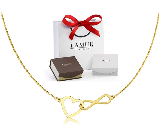 Ten wyjątkowy złoty naszyjnik próby 585 to połączenie dwóch najpiękniejszych symboli – serca i nieskończoności. Delikatna forma podkreśla elegancję, a jednocześnie niesie głębokie znaczenie: miłość, więź i uczucia, które trwają wiecznie. Minimalistyczny design sprawia, że naszyjnik pasuje zarówno do codziennych stylizacji, jak i wyjątkowych okazji.