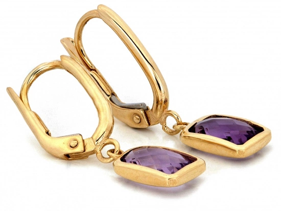 Kolczyki złote wiszące angielskie z prostokątnym fioletowym kamieniem