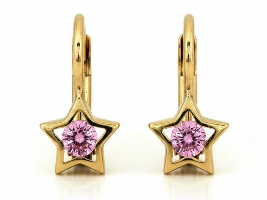 Złote kolczyki angielskie gwiazdka z różową cyrkonią