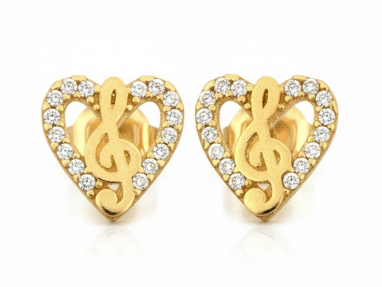Kolczyki złote serce z kluczem wiolinowym z cyrkoniami na sztyfcie